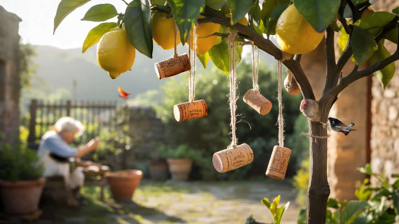 The first time I noticed them, I honestly thought the neighbor’s kids had been playing a weird game. Little cork stoppers, dangling from strings, swaying on the lemon branches like tiny rustic ornaments. The tree looked half-festive, half-mad-scientist experiment.
